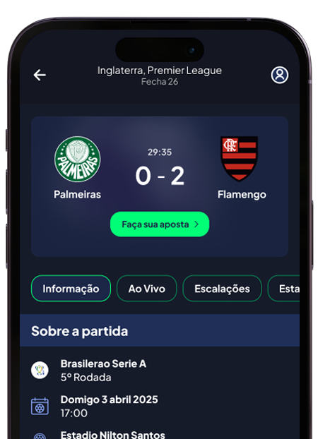 Fornecemos gráficos avançados que mostram o andamento da partida em tempo real: eventos em campo, substituições, cartões, escanteios, faltas e muito mais.